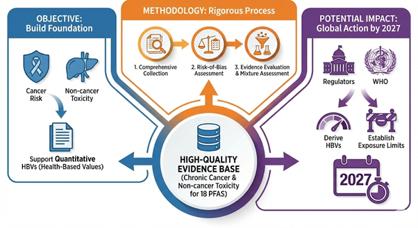The methodology involves the systematic capture, curation, and evaluation of health effects evidence for 18 prioritized PFAS compounds across six key health categories: metabolic, reproductive, developmental, cancer, immune, and hepatic. Evidence collection follows a refined protocol aligned with best practices, ensuring scientific rigor and enabling future PFAS grouping and mixtures risk assessment